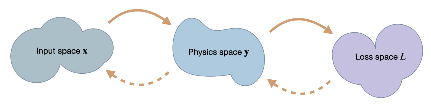 Fig. 50 We’re targeting inverse problems to retrieve an entry in \(\mathbf x\) from a loss computed in terms of output from a physics simulator \(\mathbf y\). Hence in a forward pass, we transform from \(\mathbf x\) to \(\mathbf y\), and then compute a loss \(L\). The backwards pass transforms back to \(\mathbf x\). Thus, the accuracy in terms of \(\mathbf x\) is the most crucial one, but we can likewise track progress of an optimization in terms of \(\mathbf y\) and \(L\).#