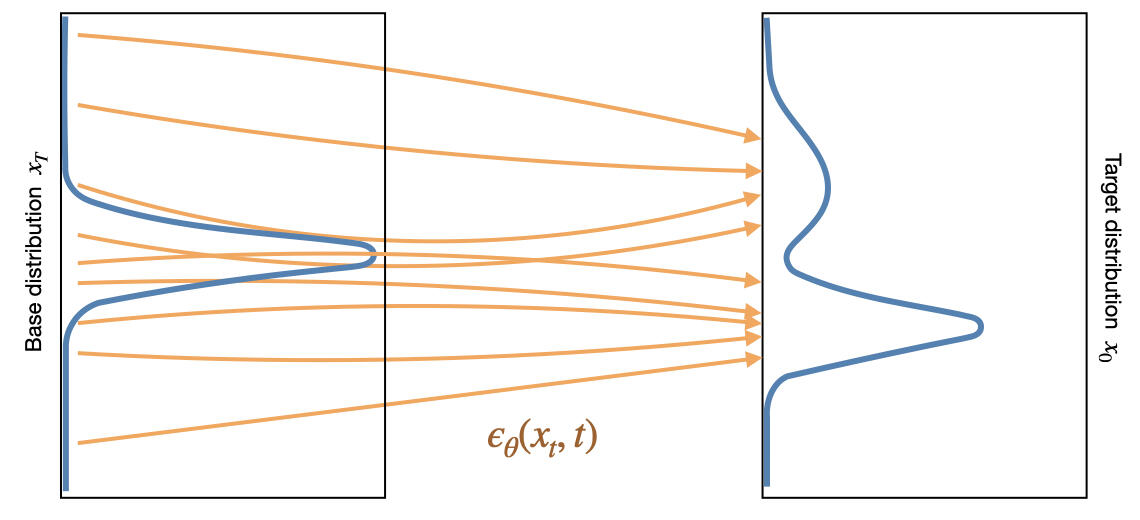 Fig. 26 DDPM process (in contrast to CNFs): denoising the simple base distribution (left) over a large number of denoising steps to arrive at a sample from the target distribution (right).#