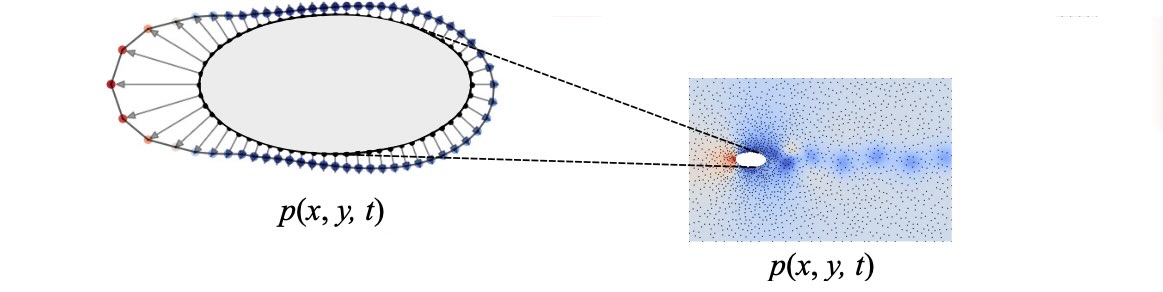 The Ellipse task used below involves a canonical fluid dynamics problem: predicting the pressure \(p\) field around an elliptical cylinder. It makes use of the graph-based representation by focusing solely on the surface of the immersed object, as shown below. This helps to reduce dimensionality, and as we’ll focus on using pretrained models, it makes this notebook easy to run.