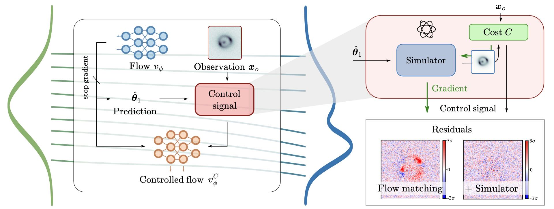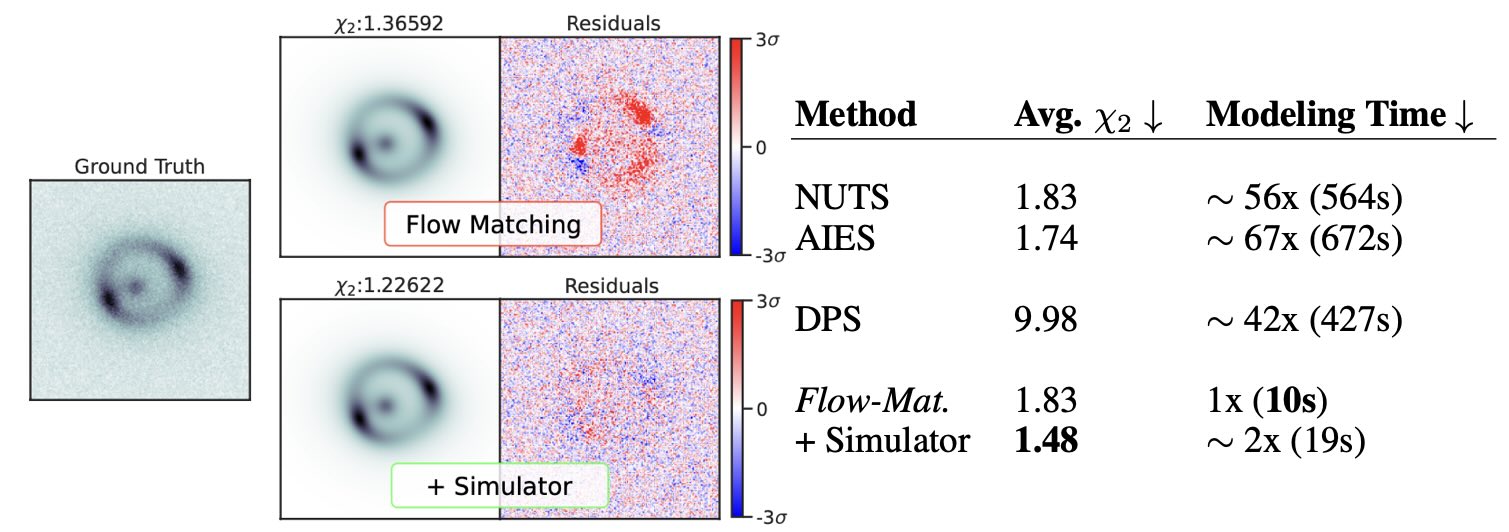 To demonstrate how these guidance from a physics solver affect the accuracy of samples and the posterior, we show an example from strong gravitational lensing: an inverse problem in astrophysics that is challenging and requires precise posteriors for accurate modeling of observations. In galaxy-scale strong lenses, light from a source galaxy is deflected by the gravitational potential of a galaxy between the source and observer, causing multiple images of the source to be seen. Traditional computational approaches require several minutes to many hours or days to model a single lens system. Therefore, there is an urgent need to reduce the compute and inference with learning-based methods. In this experiment, it’s shown that using flow matching and the control signals with feedback from a simulator gives posterior distributions for lens modeling that are competitive with the posteriors obtained by MCMC-based methods. At the same time, they are much faster at inference.