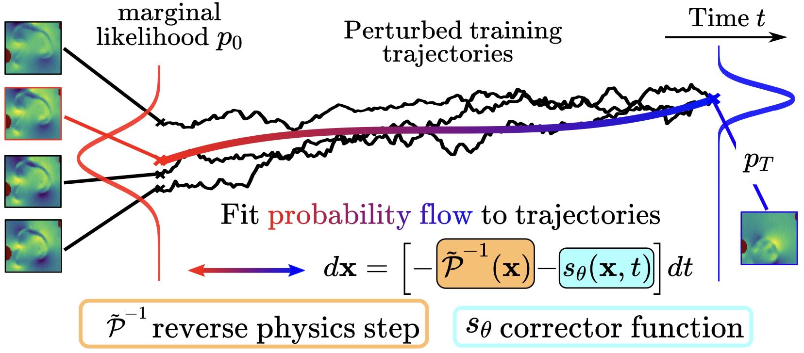 Despite the powerful capabilities of diffusion- and flow-based networks for generative modeling that we discussed in the previous sections, there is no direct feedback loop between the network, the observation and the sample at training time. This means there is no direct mechanism to include physics-based constraints such as priors from PDEs. As a consequence, it’s very difficult to produce highly accurate samples based on learning alone: For scientific applications, we often want to make sure the errors go down to any chosen threshold.