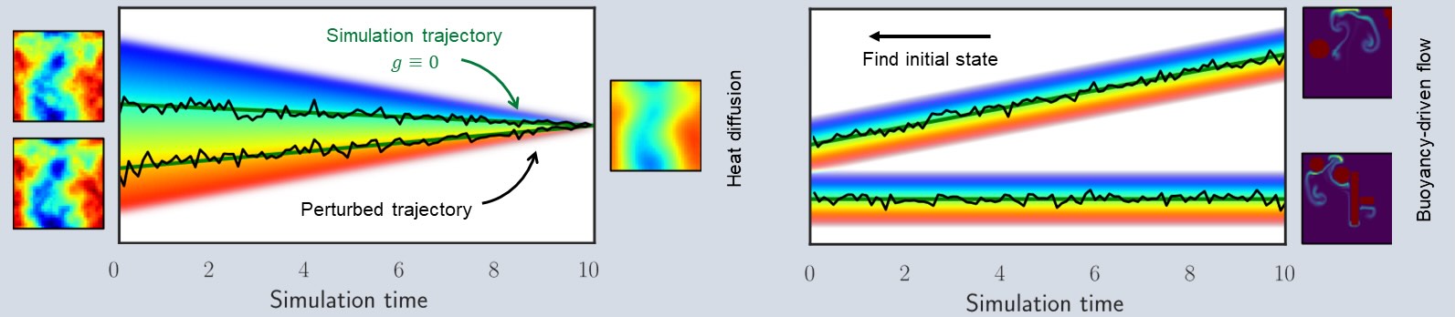 Fig. 31 The physics process (heat diffusion as an example, left) perturbs and “destroys” the initial state. At inference time (right, Buoyancy flow as an example), the solver is used to compute inverse steps and produce solutions by combining steps along the score and the gradient of the solver.#