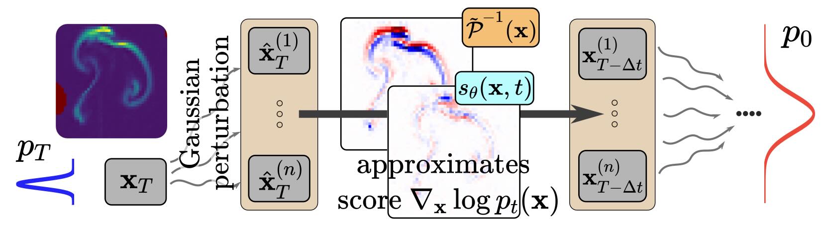 In this equation, the term \(s_\theta(\mathbf{x}_{m+1}, t_{m+1})\) corrects approximation errors and resolves uncertainties from the stochastic forcing \(F_{t_m}(z_m)\). Potentially, this process can be unrolled over multiple steps at training time to improve accuracy and stability. At inference, time the stochastic differential equation
