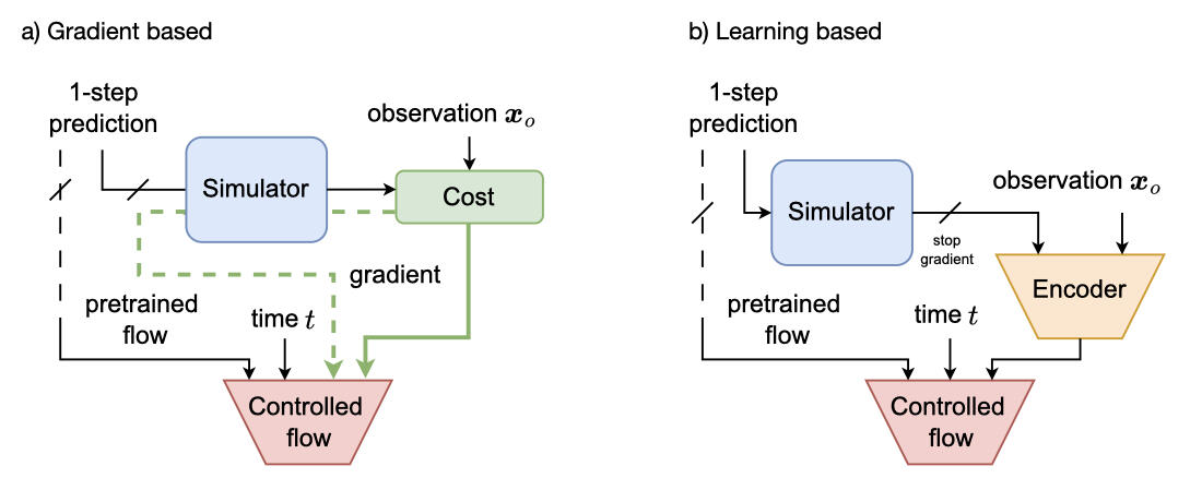In the formulation above, the approximation \(\hat{x}_1\) only influences the control signal, which is an input to the controlled flow network \(v_\theta^C\). In the case of a deterministic simulator, this makes the control signal a function of \(x_t\). The controlled flow network is trained with the same loss as vanilla flow matching. This has the nice consequence that the theoretical properties are preserved. This is in contrast to e.g. “likelihood-based guidance”, which uses an approximation for \(\nabla_{x_t} \log p(y|x_t)\) as a guidance term during inference, which is not covered by the original flow matching theory.