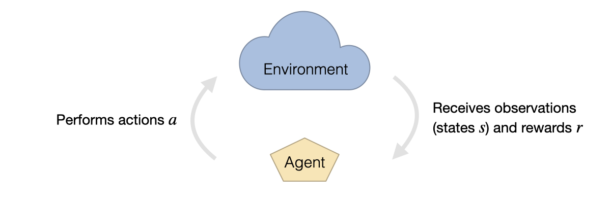 Fig. 48 Reinforcement learning is formulated in terms of an environment that gives observations in the form of states and rewards to an agent. The agent interacts with the environment by performing actions.#